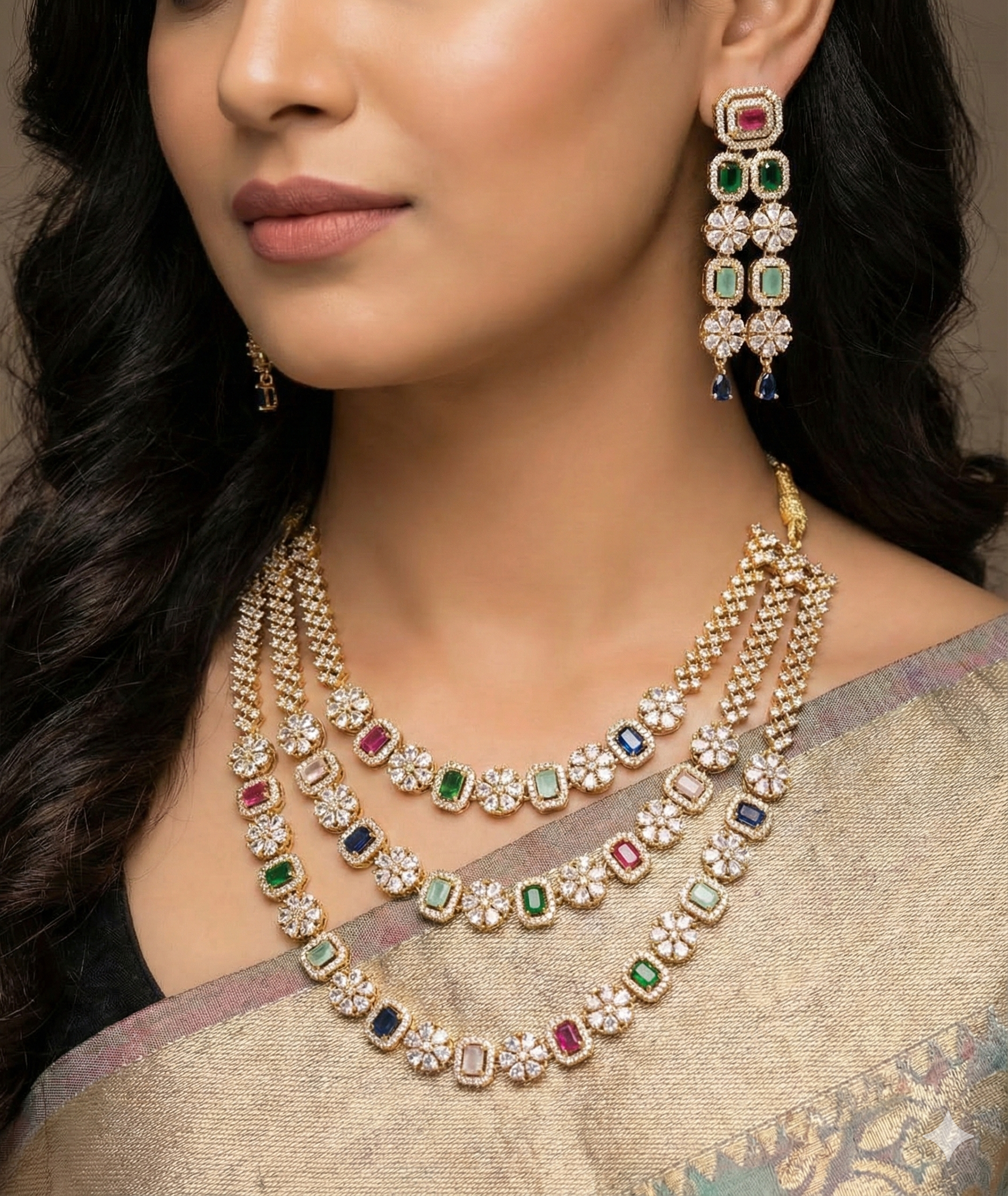 Elevate your ethnic wardrobe with this stunning multi-layered American Diamond (AD) necklace set. Expertly crafted with a radiant gold finish, this three-strand necklace features a beautiful fusion of classic floral designs and modern geometric cuts.