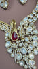 Embrace royal elegance with this stunning peacock-inspired bridal necklace set, exquisitely crafted to capture the beauty of the majestic bird. The necklace features intricate gold detailing adorned with shimmering white stones and rich ruby-red accents, forming a graceful peacock motif. Paired with matching statement earrings, this set radiates timeless charm and luxury — perfect for weddings, festive celebrations, or grand occasions.