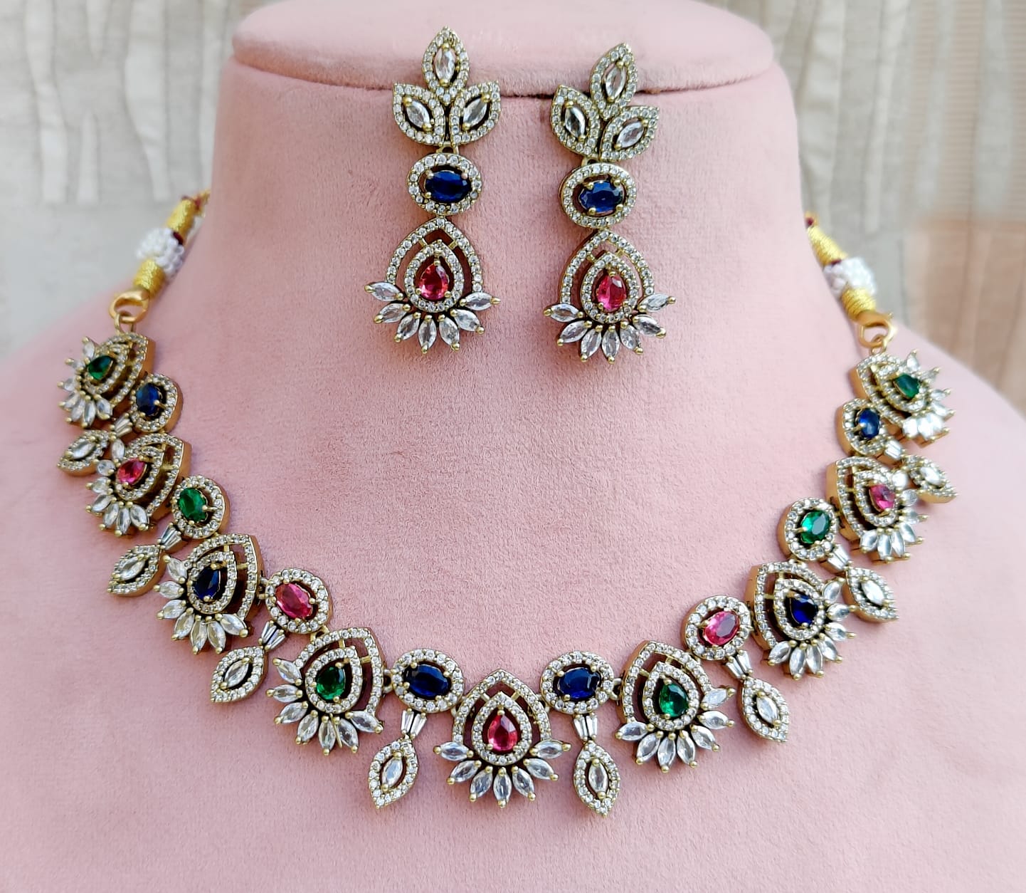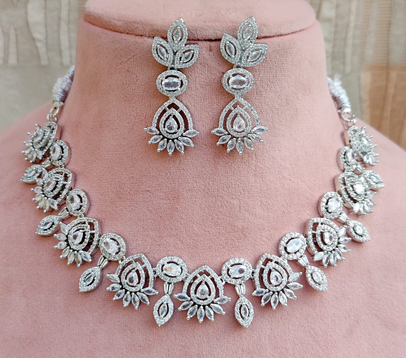 Crafted with meticulous detail, this stunning jewelry set features a necklace and matching earrings adorned with sparkling rose pink and white stones. The intricate design showcases a graceful arrangement of floral-inspired motifs, creating a look that is both timeless and sophisticated. The necklace is a perfect statement piece, while the earrings add a touch of elegance. This set is ideal for special occasions, weddings, or any event where you want to shine.
