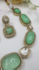 Adorn yourself with the regal elegance of this exquisite antique gold-toned choker necklace set, featuring a captivating array of natural green stones and sparkling Polki (uncut diamond) accents. Each oval and rectangular green stone is meticulously set in an ornate gold-toned frame, creating a rich and luxurious feel.
