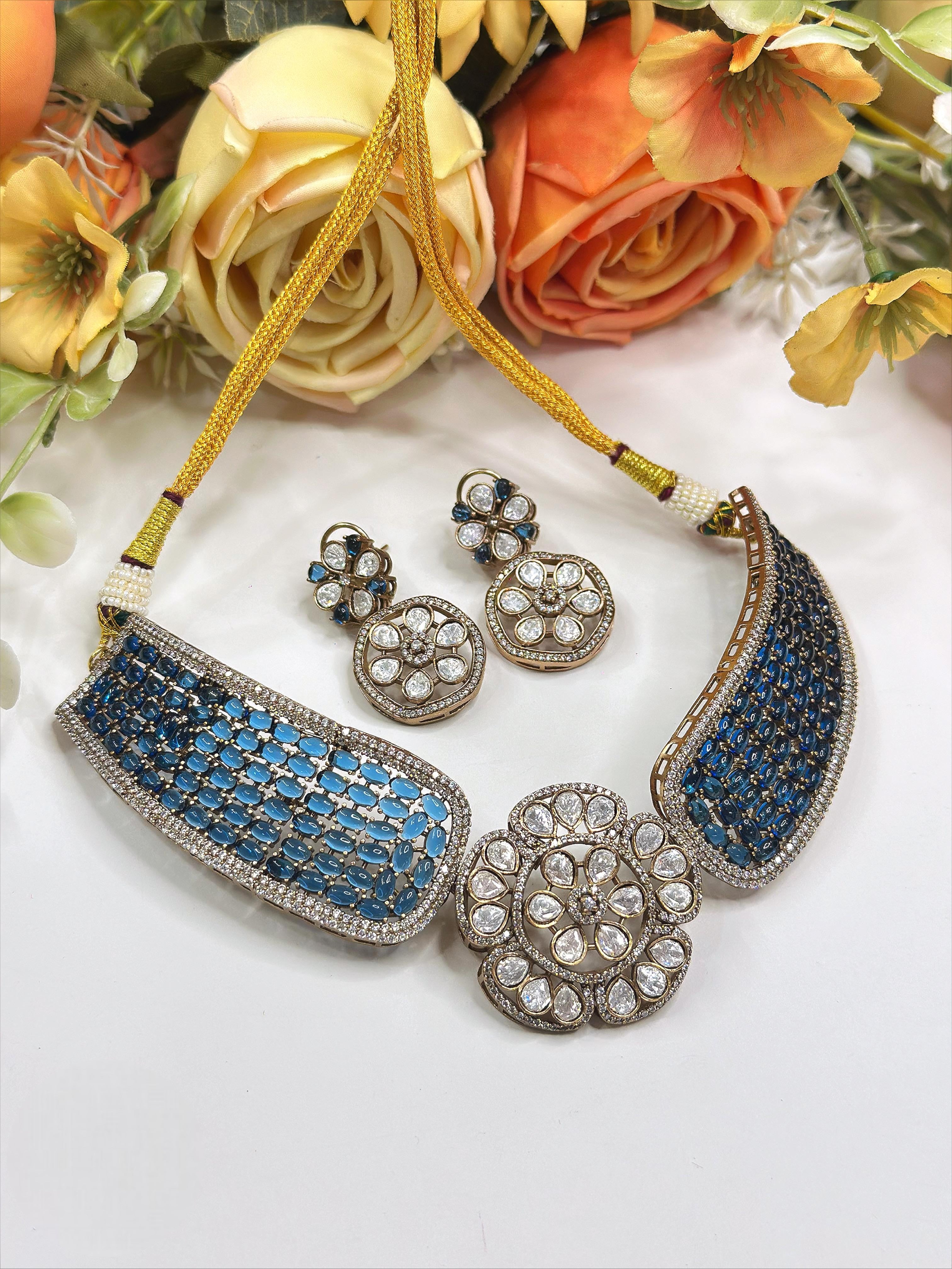Celebrate the upcoming festivities in style with this Blue Enamel Designer Choker Necklace Set with Matching Earrings. Featuring an intricate floral motif centerpiece embellished with kundan-style stones, this exclusive necklace blends modern luxury with traditional craftsmanship. The rich blue enamel detailing and sparkling white stones make it the perfect statement piece for weddings, parties, and festive occasions.