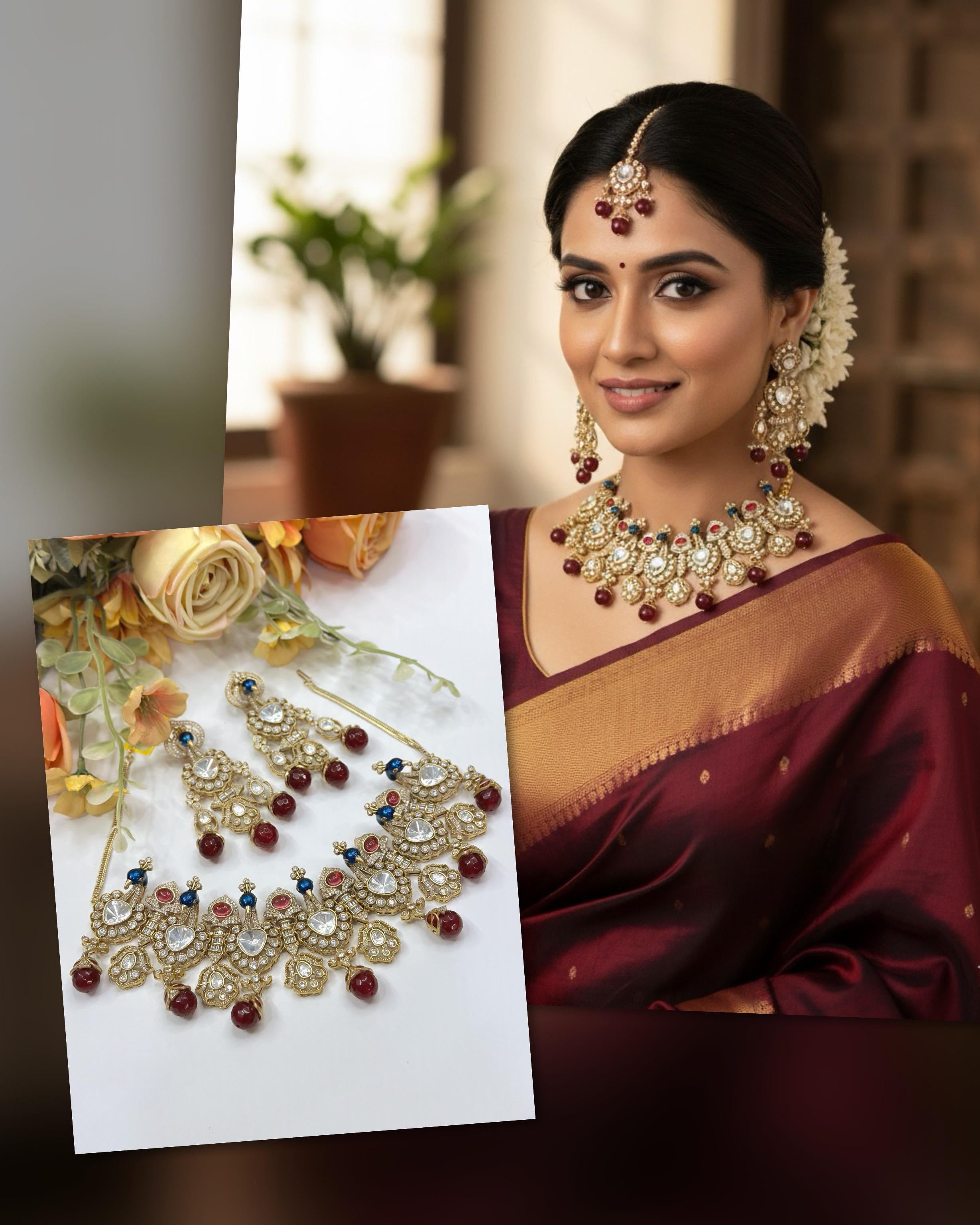 Dazzling gold-toned choker featuring intricate Polki stones, vibrant ruby red beads, and subtle blue accents. Comes with stunning matching jhumka earrings. Perfect for weddings & festive occasions!