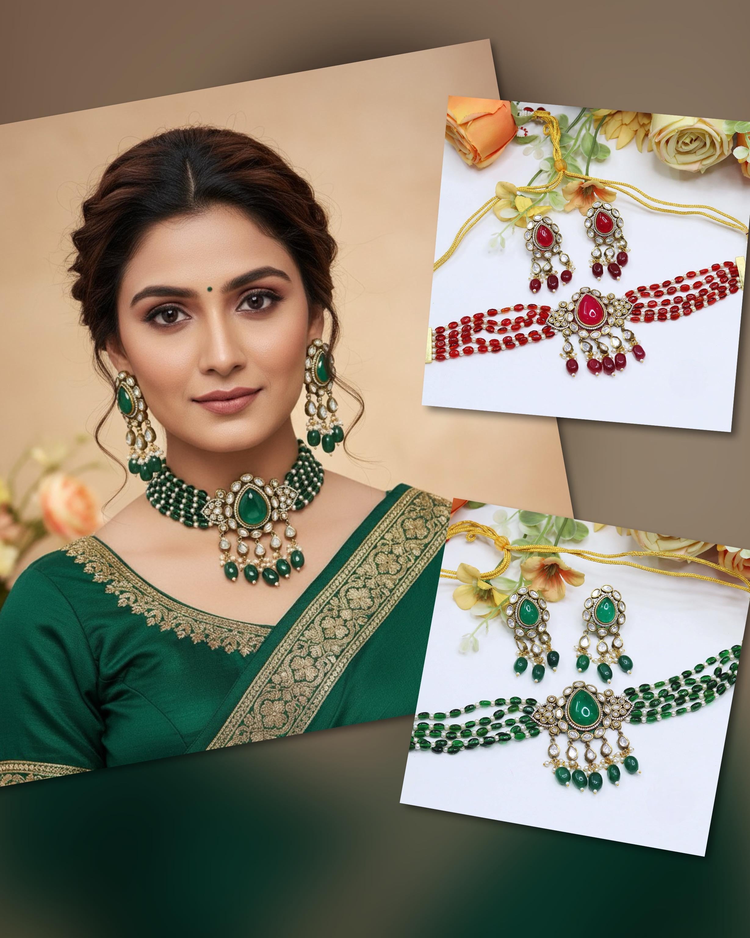 Make a royal statement with this Green Beaded Kundan Necklace Set with Earrings, crafted to perfection for brides and festive occasions. The necklace features multiple strands of glossy green beads, highlighted with a grand kundan pendant embellished with dazzling stones. Matching earrings with intricate detailing complete the regal look, making it a must-have for weddings, parties, and celebrations.