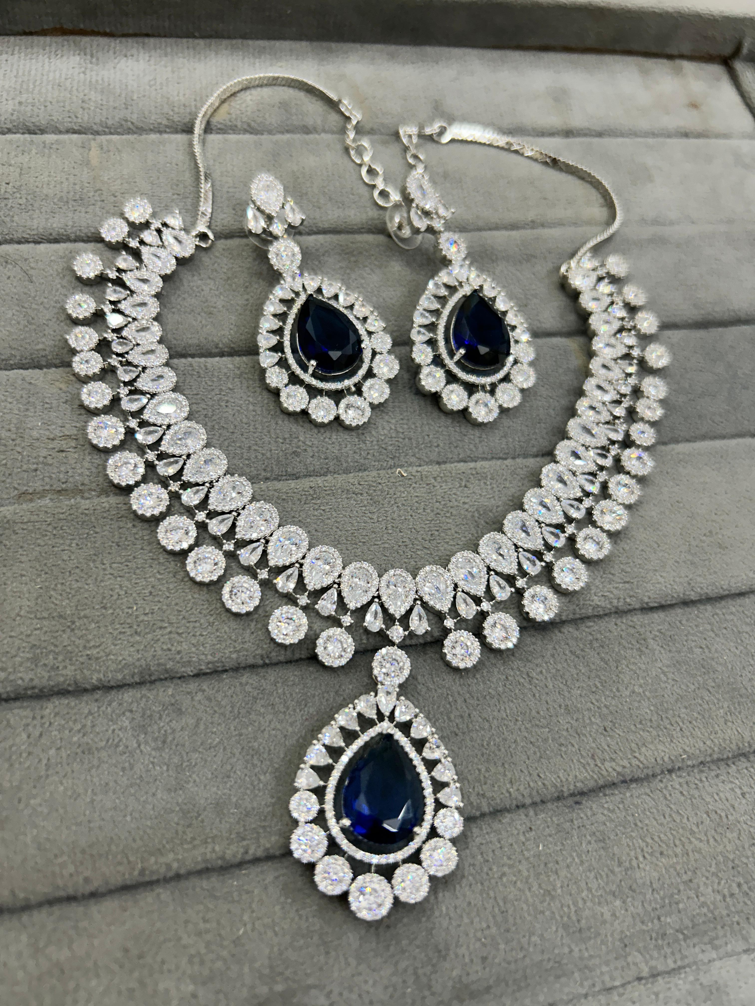 Turn heads with this exquisite Luxury Teardrop CZ Diamond Choker Necklace Set, crafted to perfection for brides and special occasions. This silver-toned set features a dazzling array of high-quality cubic zirconia stones arranged in a double-layered design that radiates elegance. The matching statement earrings complete the set, making it a perfect choice for weddings, receptions, or festive celebrations.