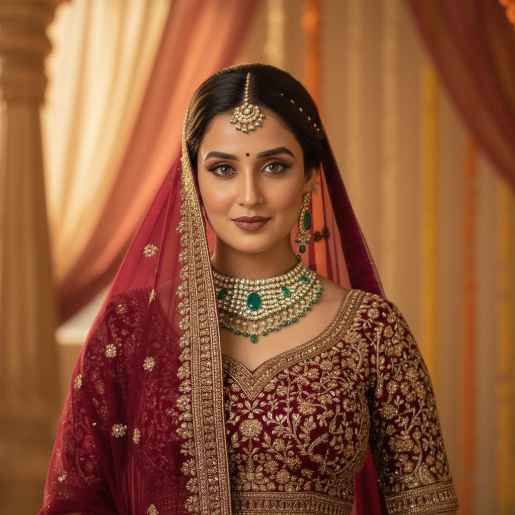Make a royal statement with this premium Kundan choker necklace set, exquisitely designed with emerald green stones, sparkling white Kundan work, and delicate pearl bead drops. This elegant necklace set comes with matching statement earrings, making it an ideal choice for bridal wear, weddings, receptions, and festive celebrations.