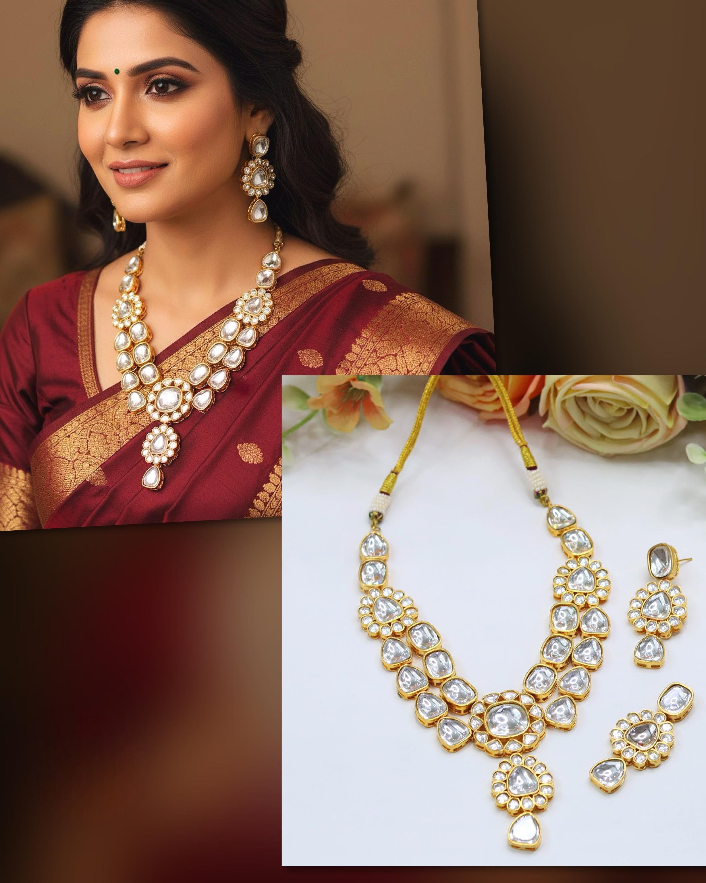 Make your special day unforgettable with our White Kundan Bridal Necklace & Earrings Set. Featuring exquisite white Kundan stones, this handcrafted jewelry set adds a touch of elegance and sophistication to any bridal ensemble.