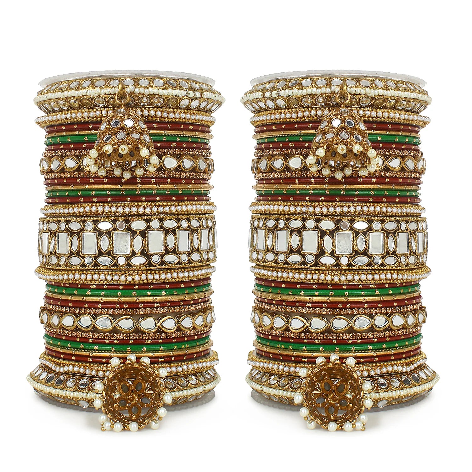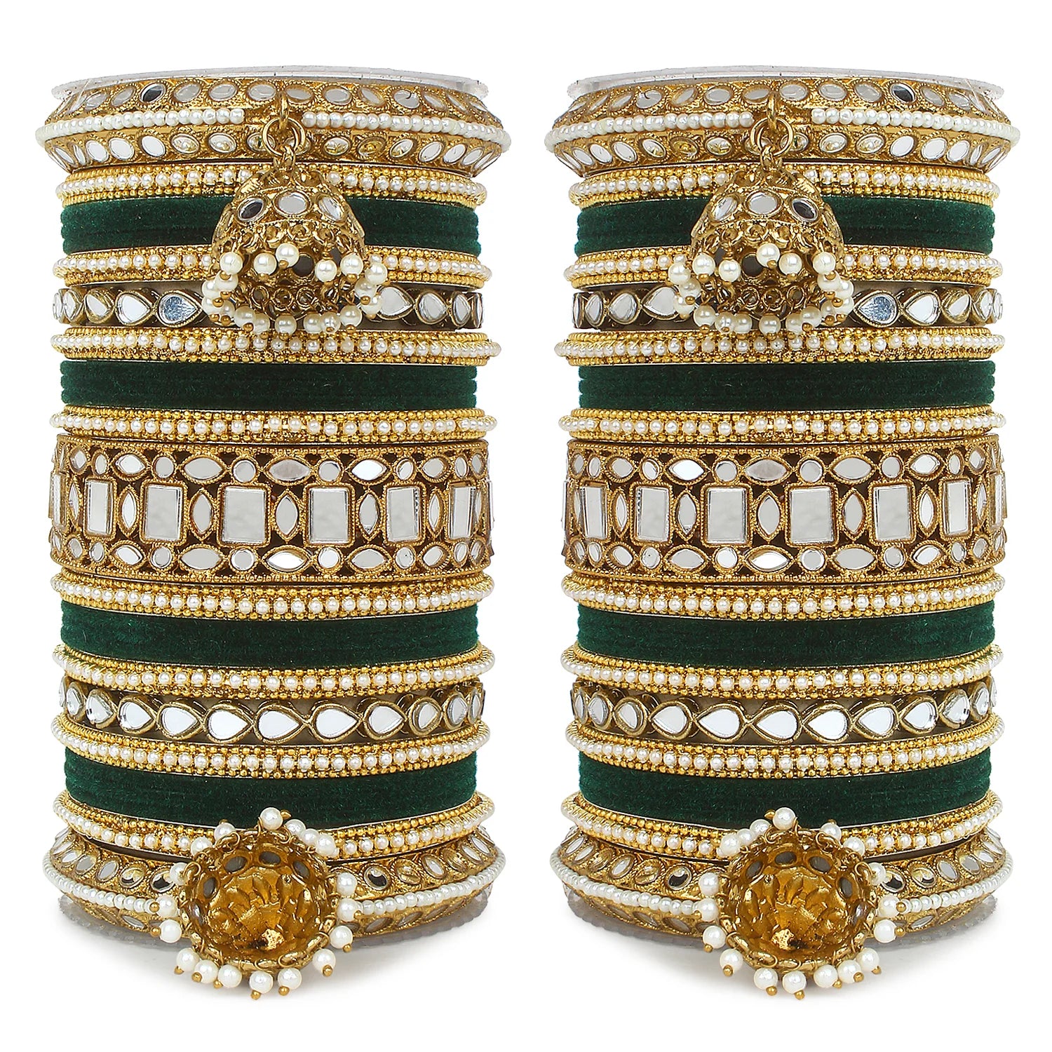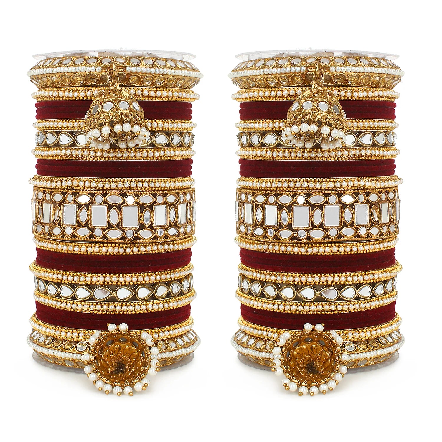 Complete your bridal look with this Designer Mirror & Velvet Bridal Bangle Set with Jhumki, crafted to reflect timeless Indian elegance and traditional charm. This stunning wedding chuda set beautifully combines sparkling mirror work, soft velvet-finished bangles, and elegant hanging jhumki details to create a rich and royal appearance.