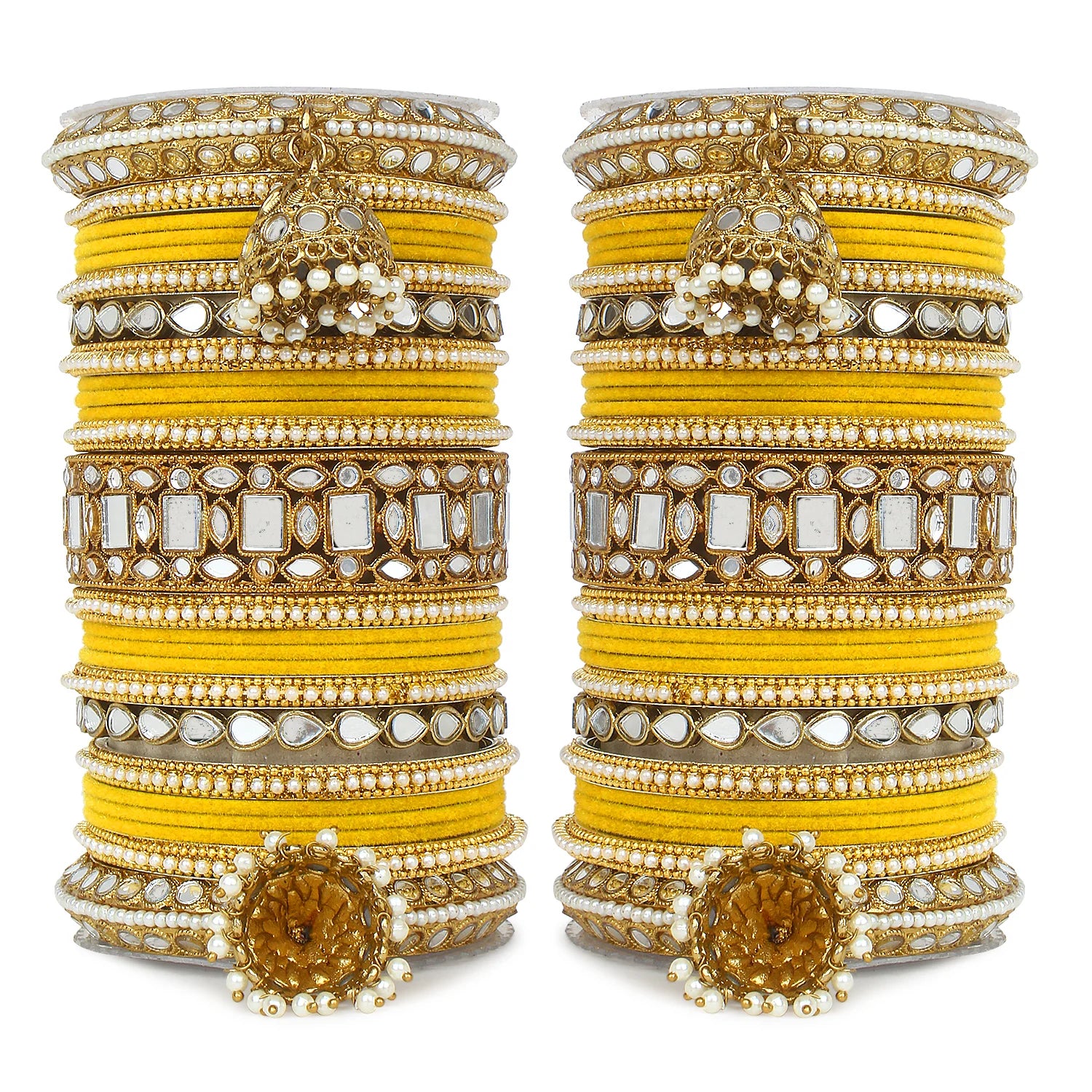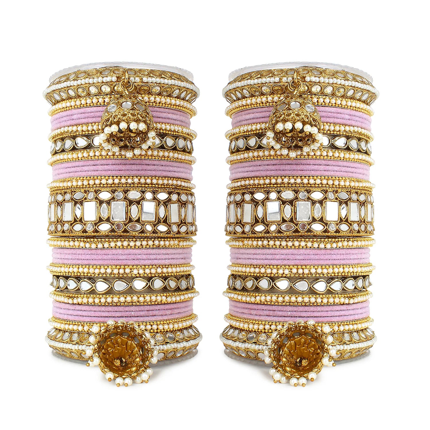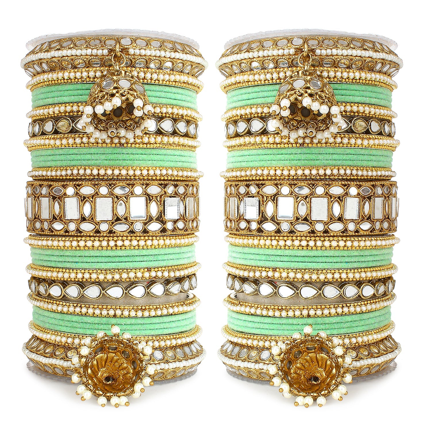 Complete your bridal look with this Designer Mirror & Velvet Bridal Bangle Set with Jhumki, crafted to reflect timeless Indian elegance and traditional charm. This stunning wedding chuda set beautifully combines sparkling mirror work, soft velvet-finished bangles, and elegant hanging jhumki details to create a rich and royal appearance.