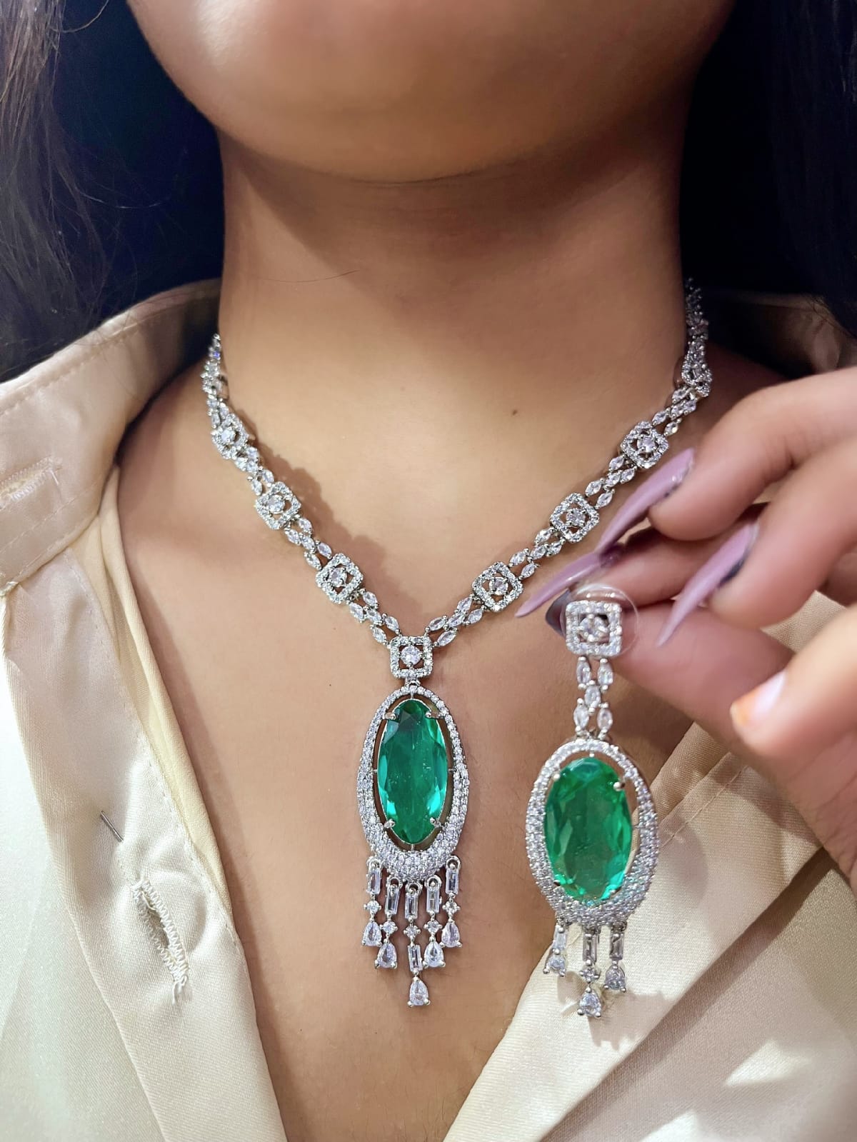 This exquisite jewelry set features a stunning necklace adorned with a large oval pink gemstone surrounded by brilliant-cut diamonds. The pendant showcases intricate diamond detailing with dangling teardrop-shaped stones, adding luxurious sparkle and movement. Perfectly complemented by a matching earring design, this set exudes sophistication and timeless glamour — ideal for weddings, formal occasions, or elegant evening wear. The piece beautifully contrasts against a soft champagne satin outfit, enhancing its radiant allure.