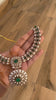This breathtaking jewelry set features a heavy antique-gold finish collar studded with ruby and white stones, leading to a magnificent emerald-green centerpiece. Intricate micro-detailing and uncut stone aesthetics give this...