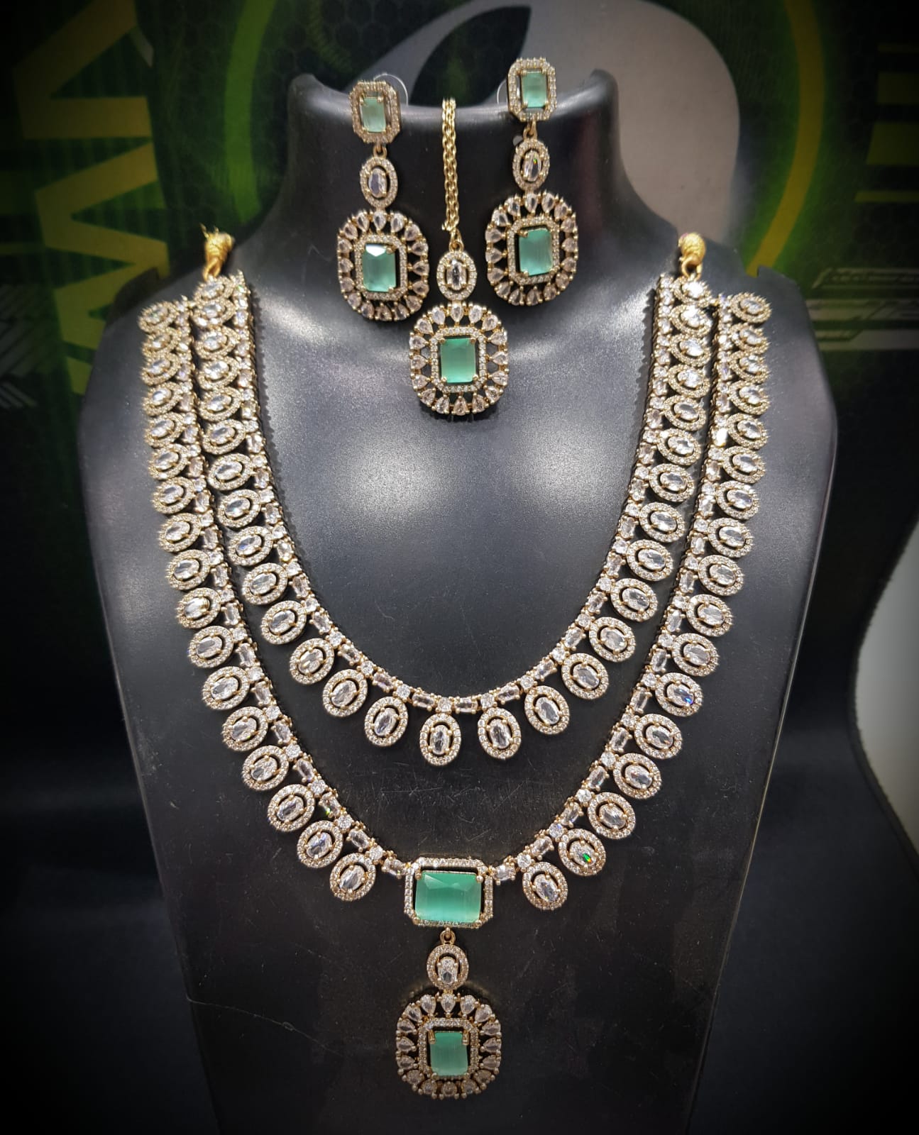 Make a royal style statement with this emerald green stone layered necklace set, beautifully crafted in a premium gold-plated finish. Designed for brides and festive occasions, this elegant set features dual-layer necklaces adorned with oval crystal detailing and a striking emerald green center pendant that adds timeless charm.