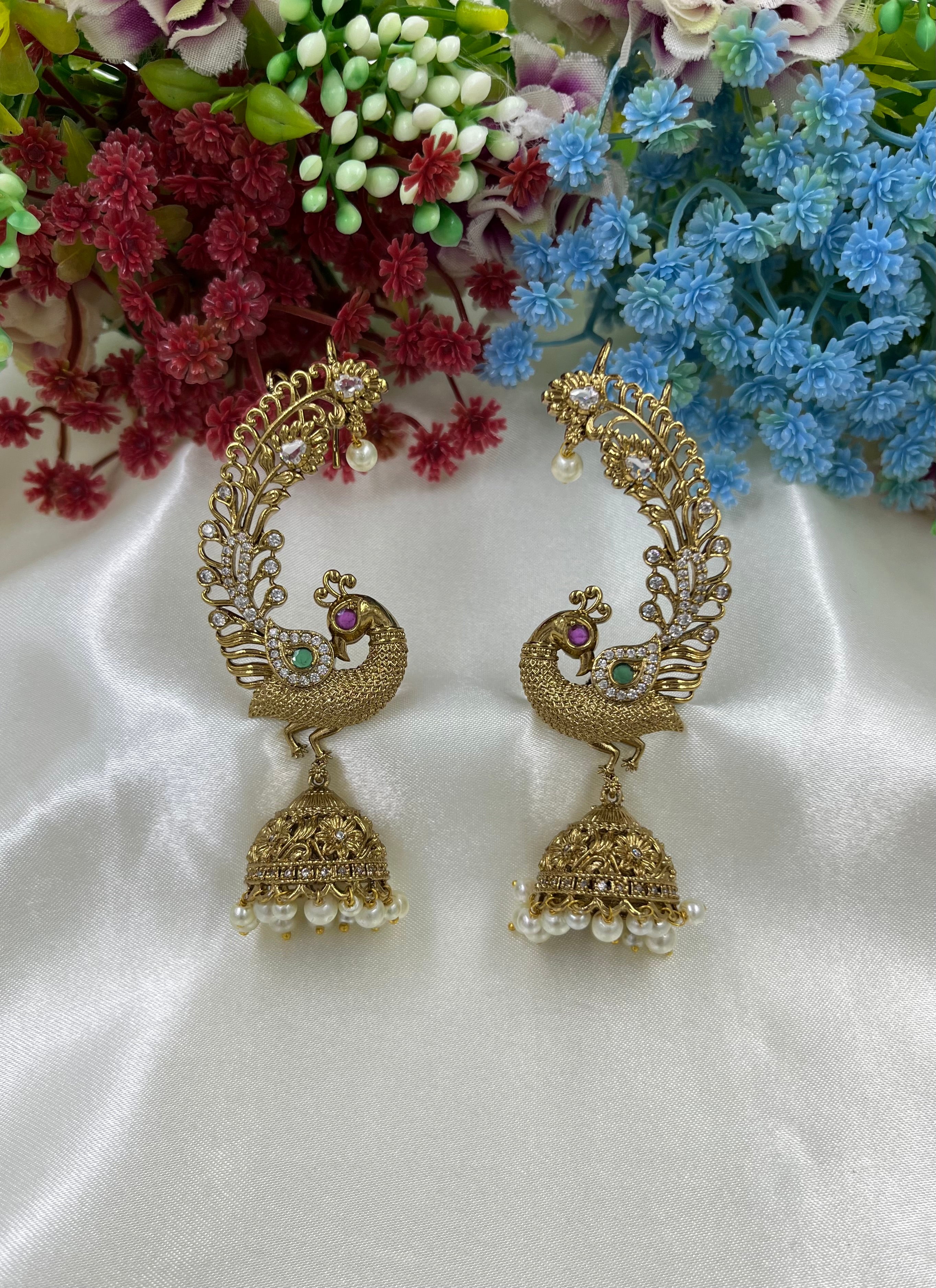 Celebrate timeless beauty with our Mayura Jhumki Earcuff Earrings, inspired by the elegance of the peacock. These exquisite earrings feature intricate craftsmanship, detailed motifs, and delicate jhumki drops that add a touch of grace and tradition to your style. Perfect for weddings, festivals, and special occasions — elevate your ethnic look with this royal masterpiece that blends classic charm with modern allure.