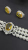 Enhance your grace with this elegant pearl choker necklace set, beautifully designed with multiple strands of lustrous pearls and a striking yellow stone centerpiece accented with diamond-style detailing. This timeless choker sits perfectly on the neckline, adding a royal and sophisticated touch to your look. Ideal for weddings, festive occasions, receptions, and traditional events, it pairs effortlessly with sarees, lehengas, and ethnic outfits. A perfect choice for women who love classic Indian jewellery with a luxurious finish, and an excellent gifting option for special celebrations.