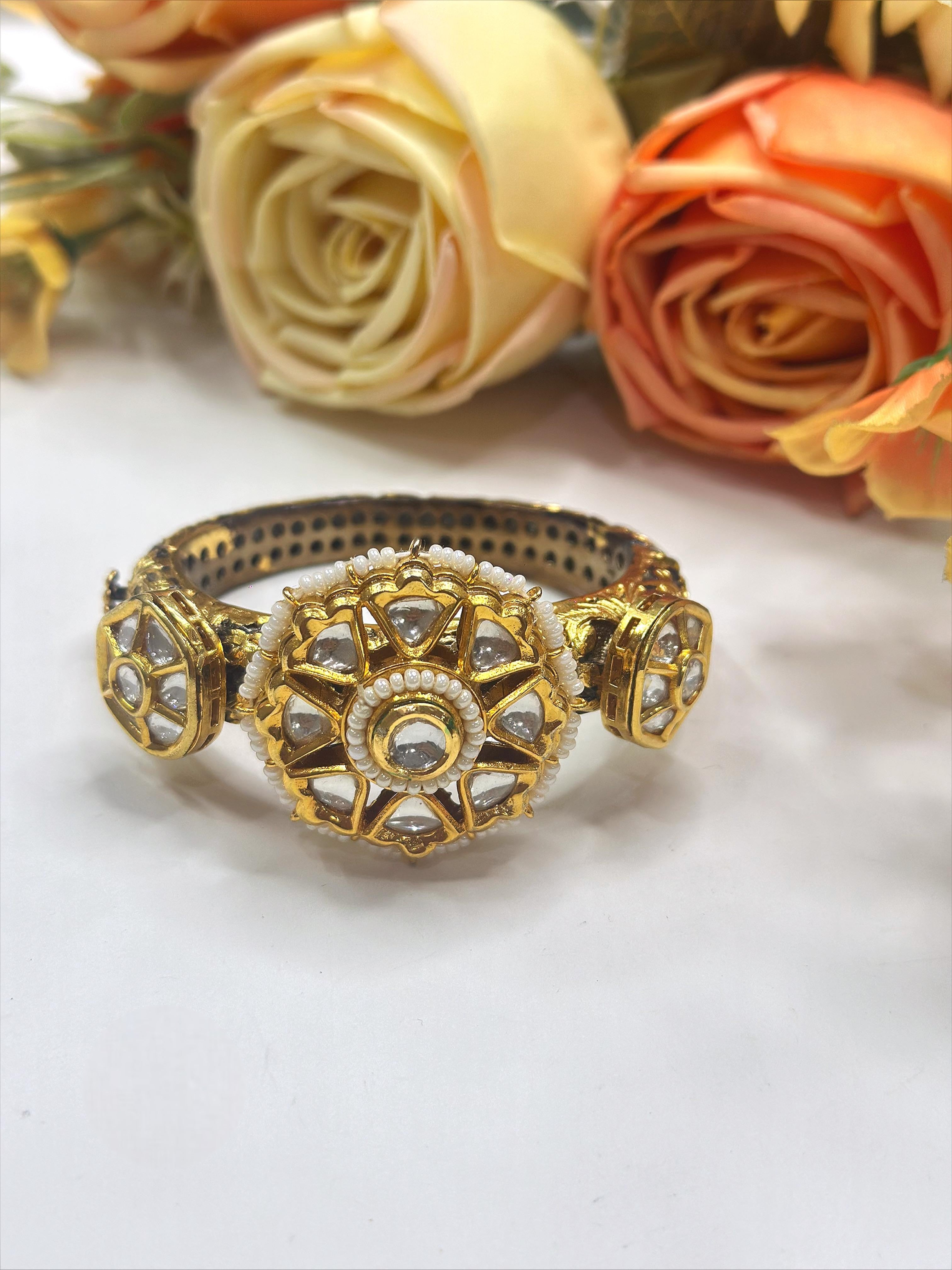 Elevate your ethnic ensemble with this exquisite gold-plated Kundan bangle, meticulously handcrafted with traditional Indian artistry. The centerpiece features a majestic floral motif adorned with shimmering white Kundan stones and intricate pearl detailing, creating a regal and timeless look.